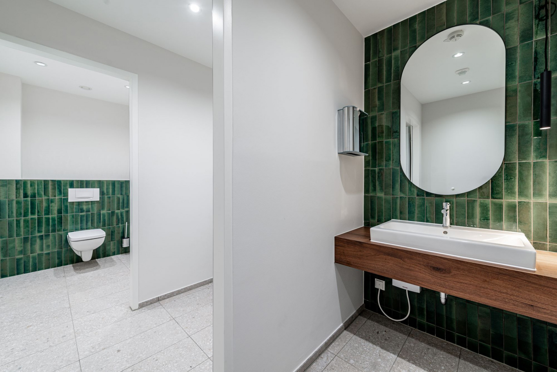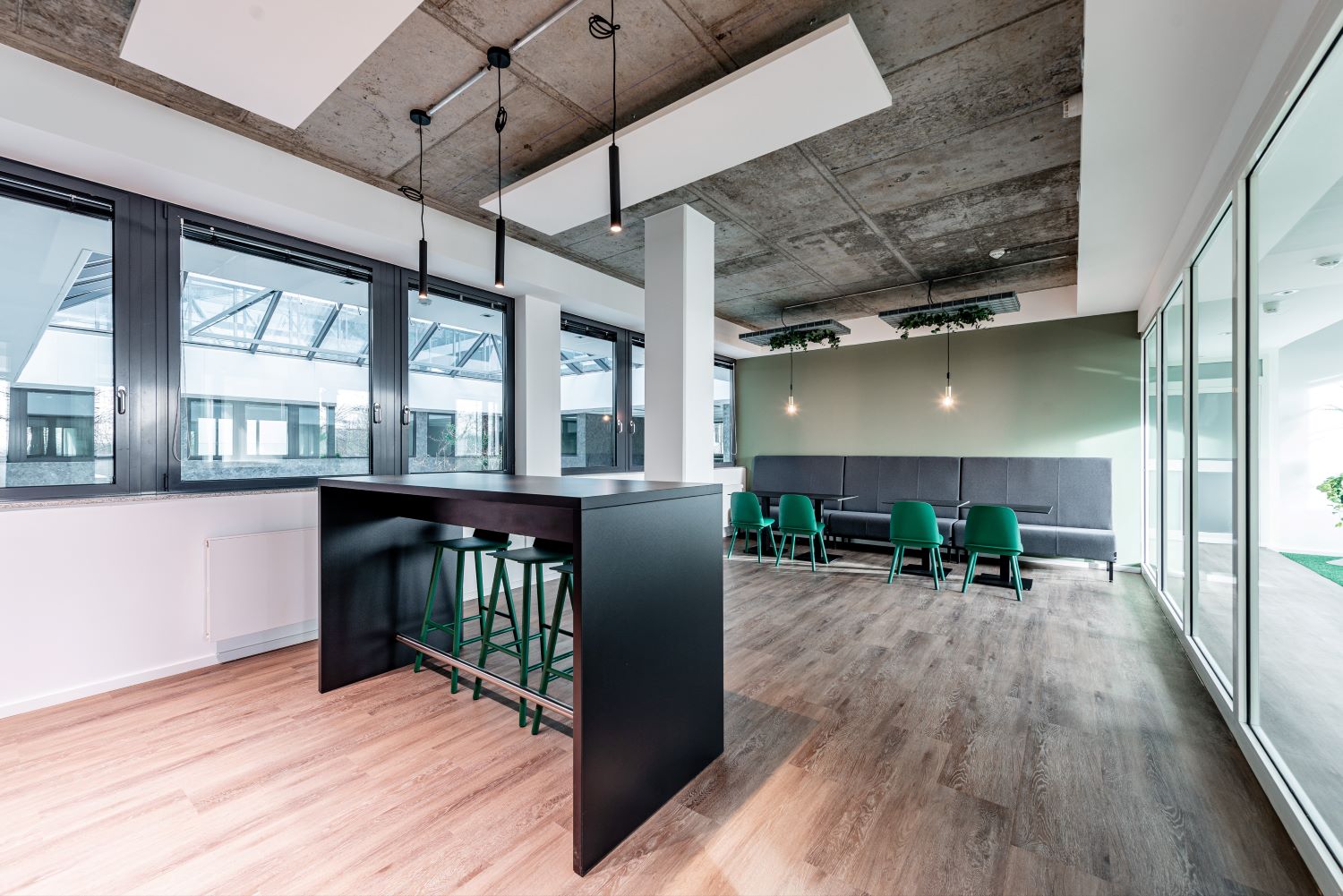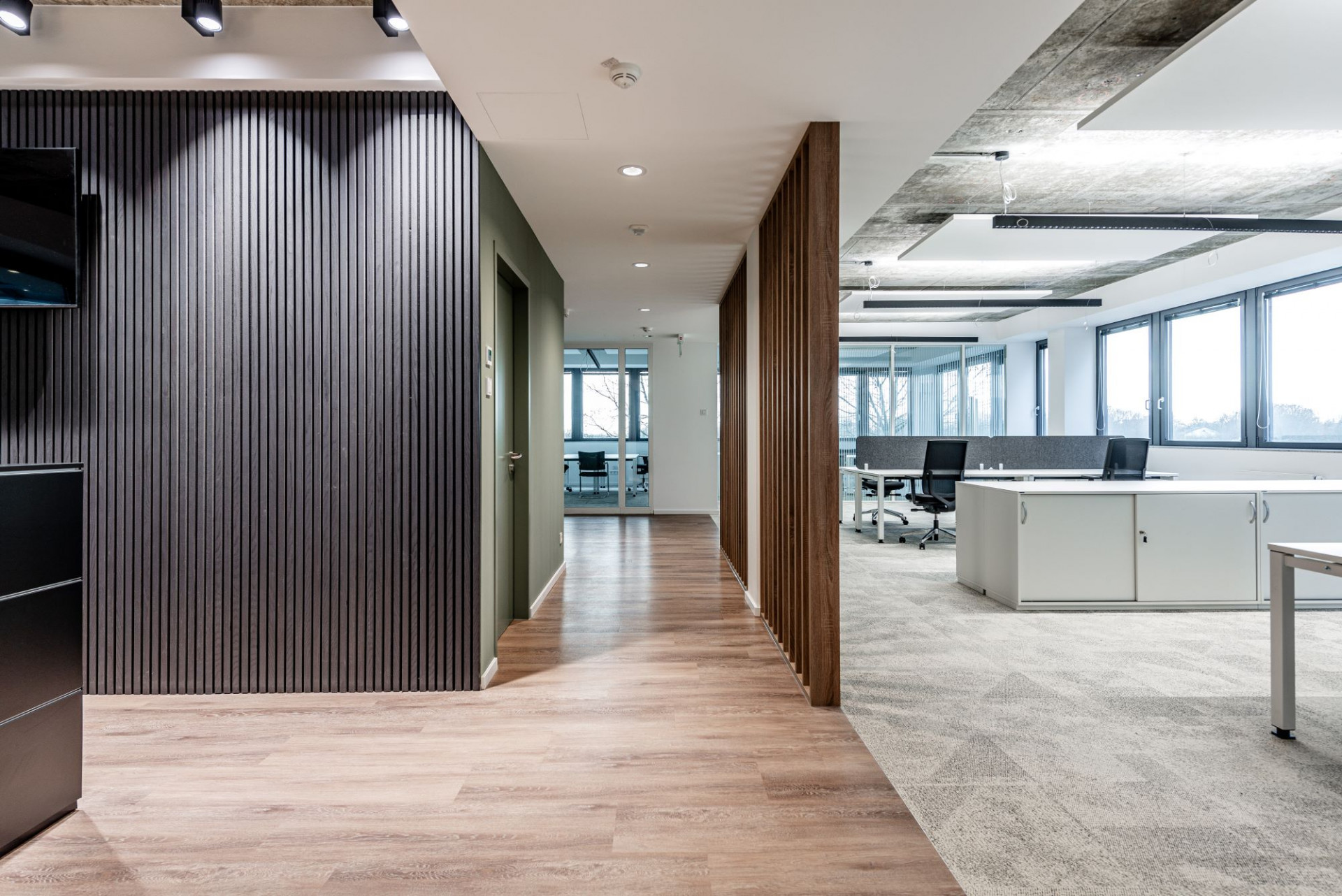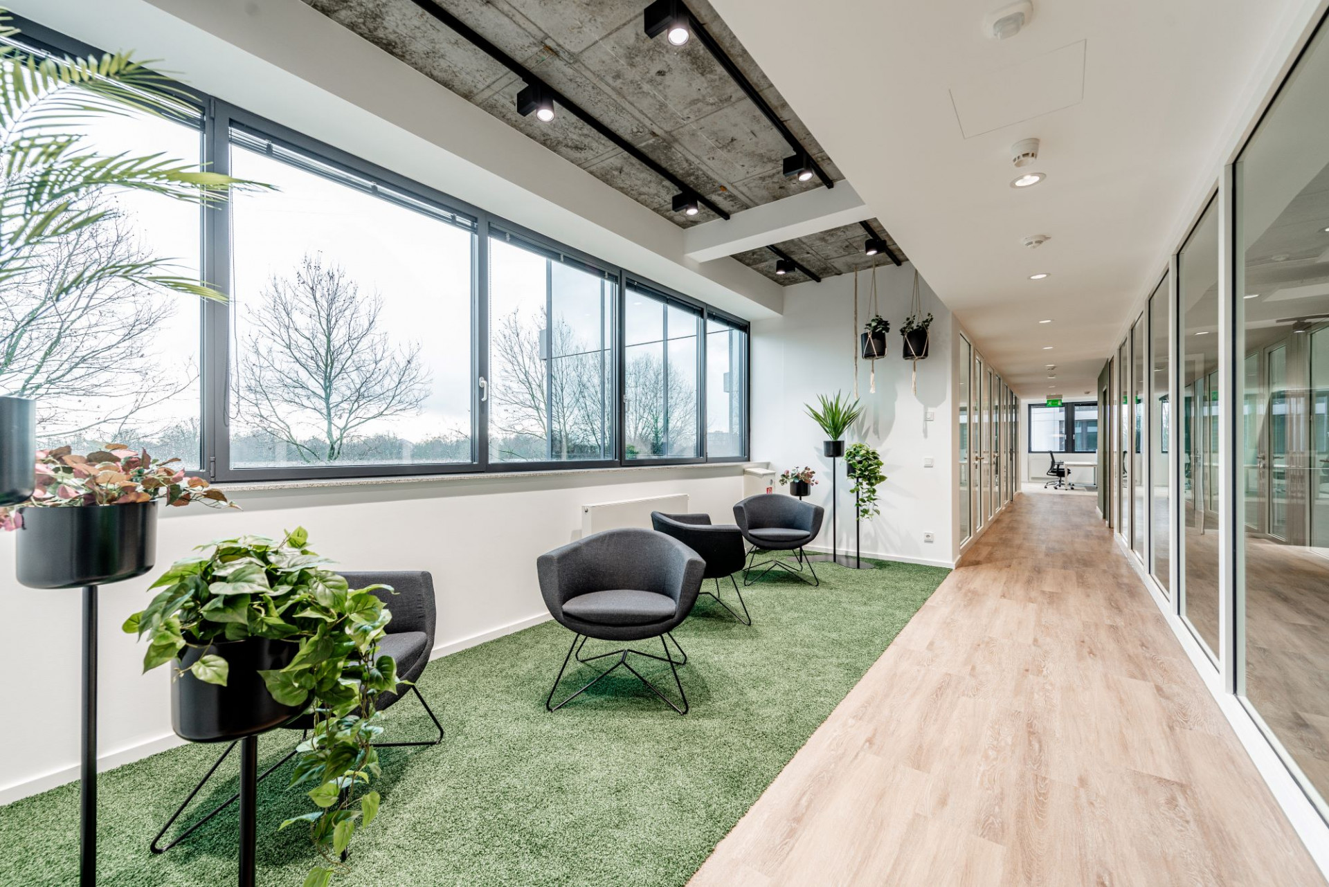 Wir haben das Foyer und das Musterbüro warm und einladend gestaltet, mit Holz, Grüntönen und Pflanzen.