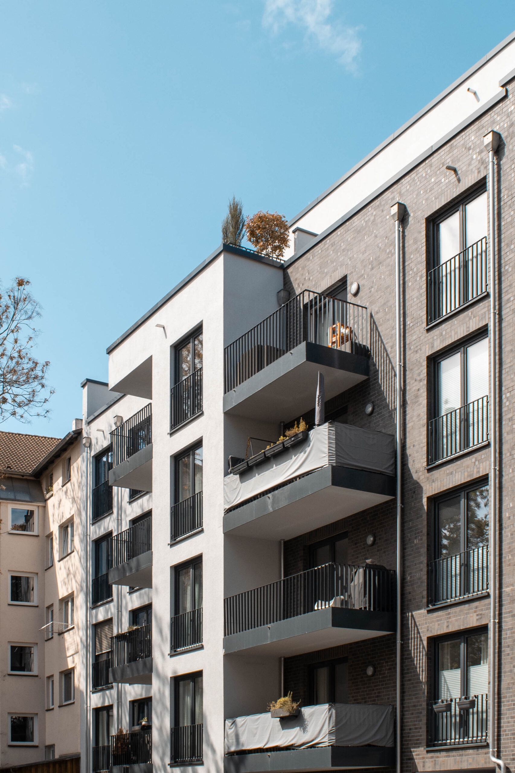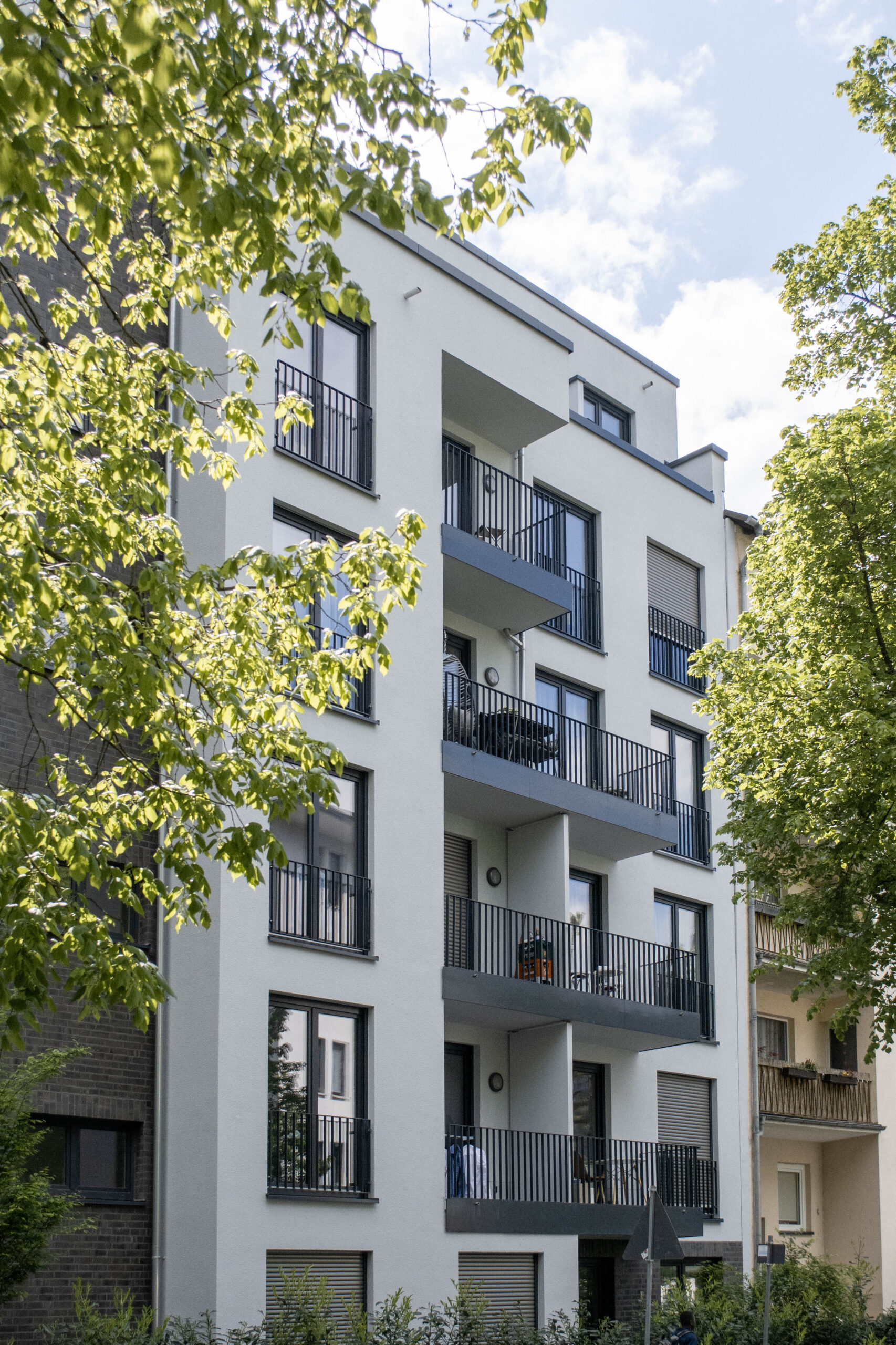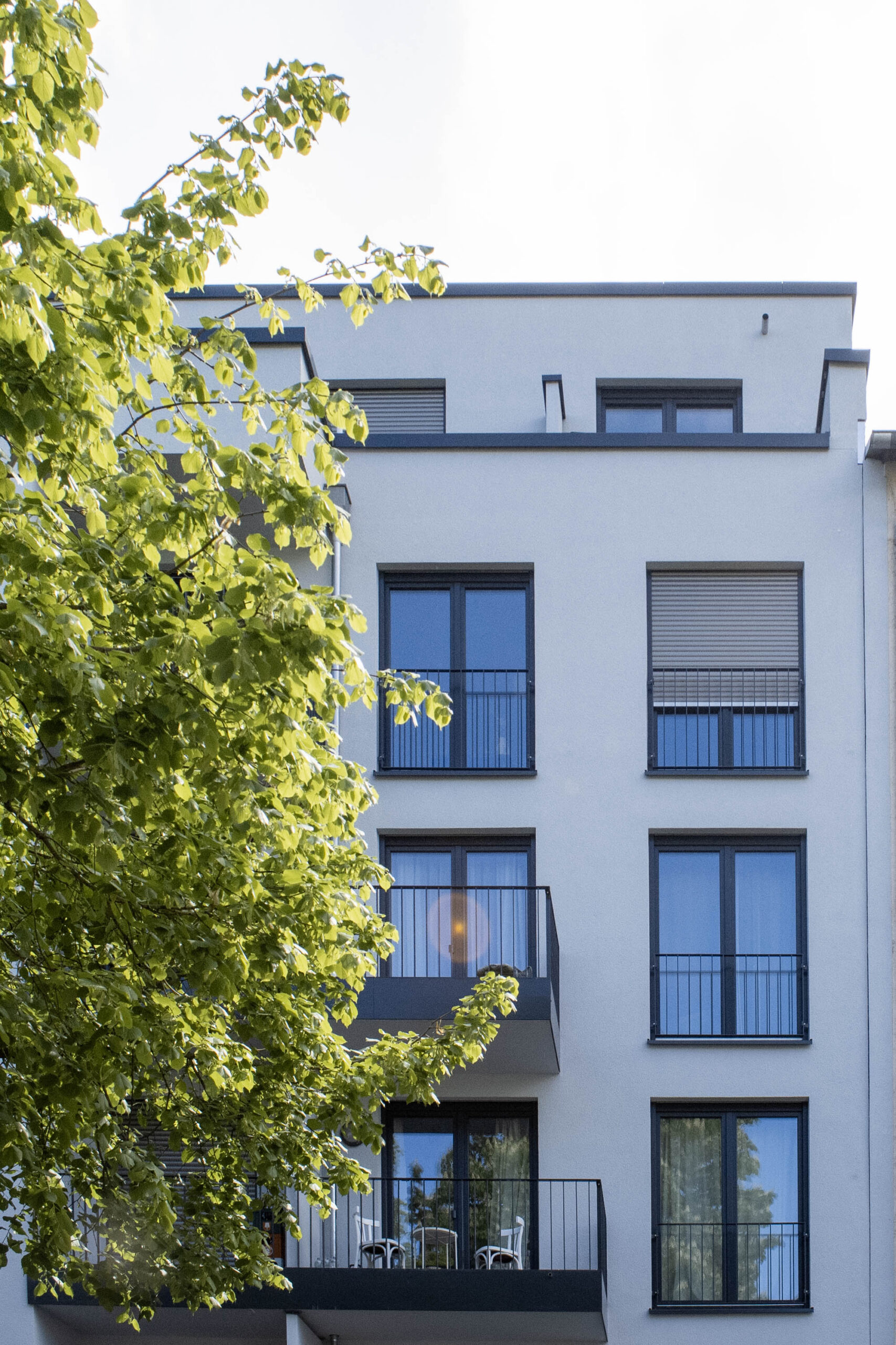 Wir haben ein Mehrfamilienhaus in die Baulücke geplant. Es sind insgesamt 21 Mietwohnungen in unterschiedlicher Größe entstanden, jeweils mit einem Balkon oder einer Dachterrasse. Durchdachte Grundrisse und Details und eine hochwertige Ausstattung machen die Wohnungen für die Bauherrn attraktiv vermietbar im hippen Ostend.