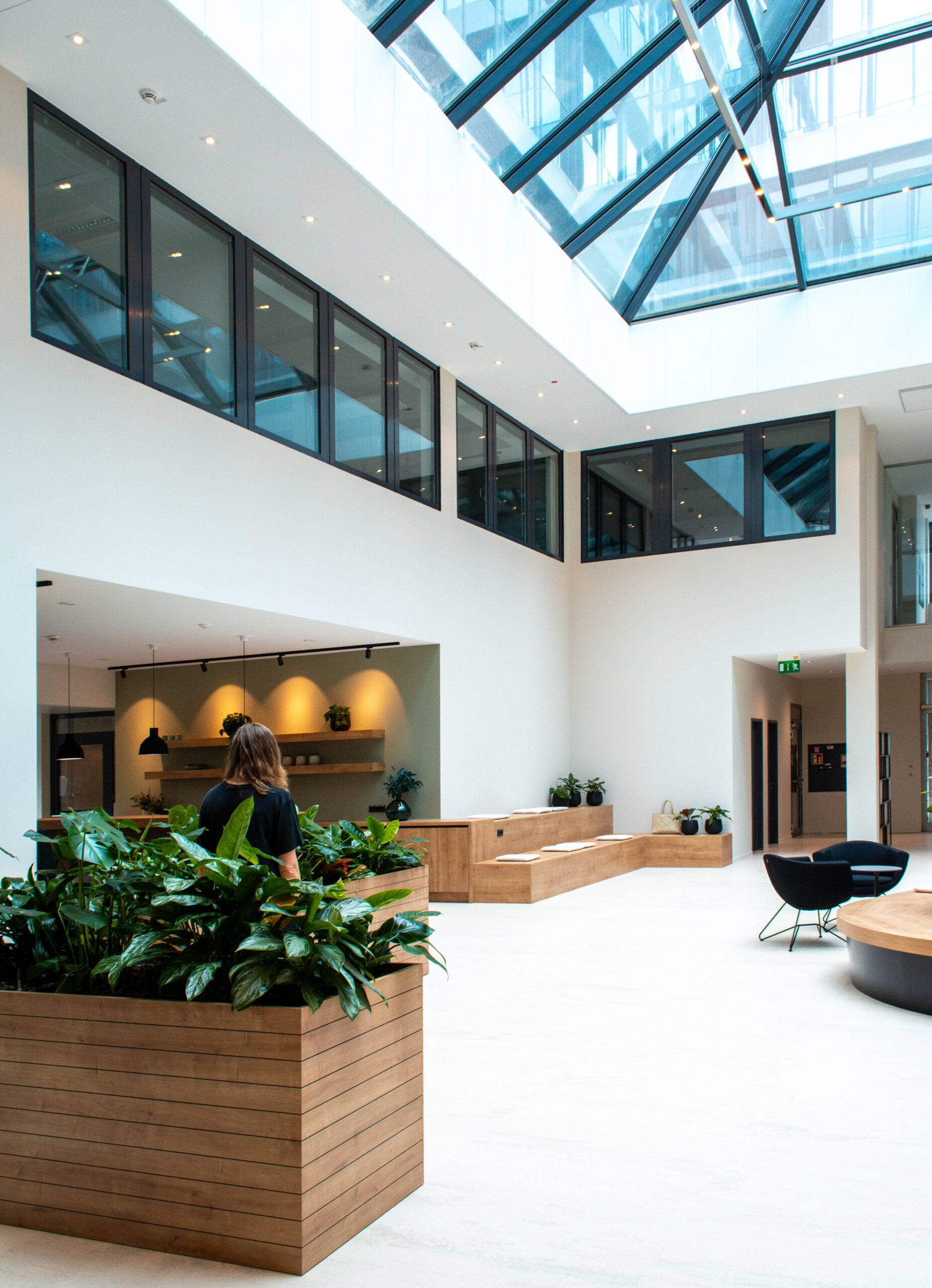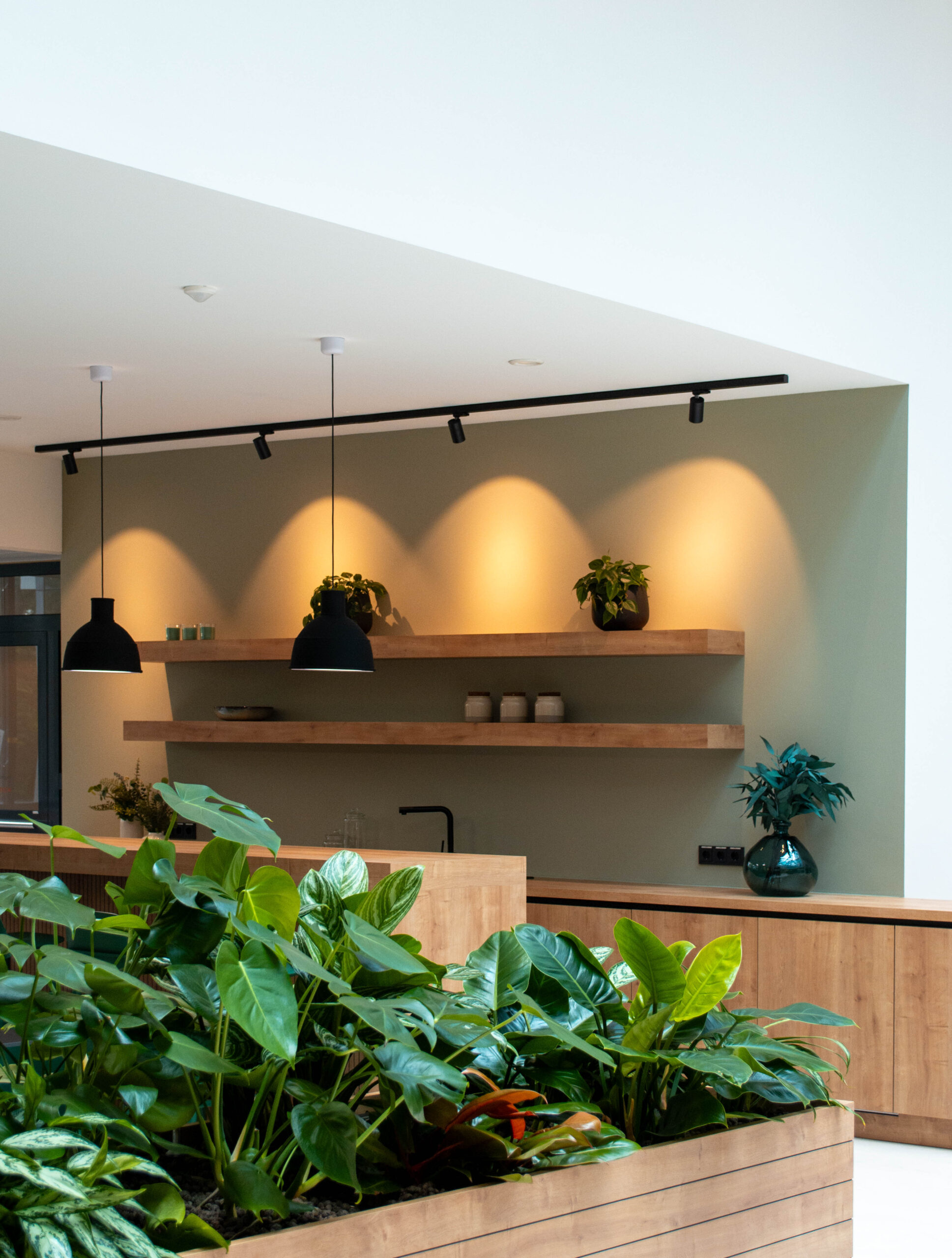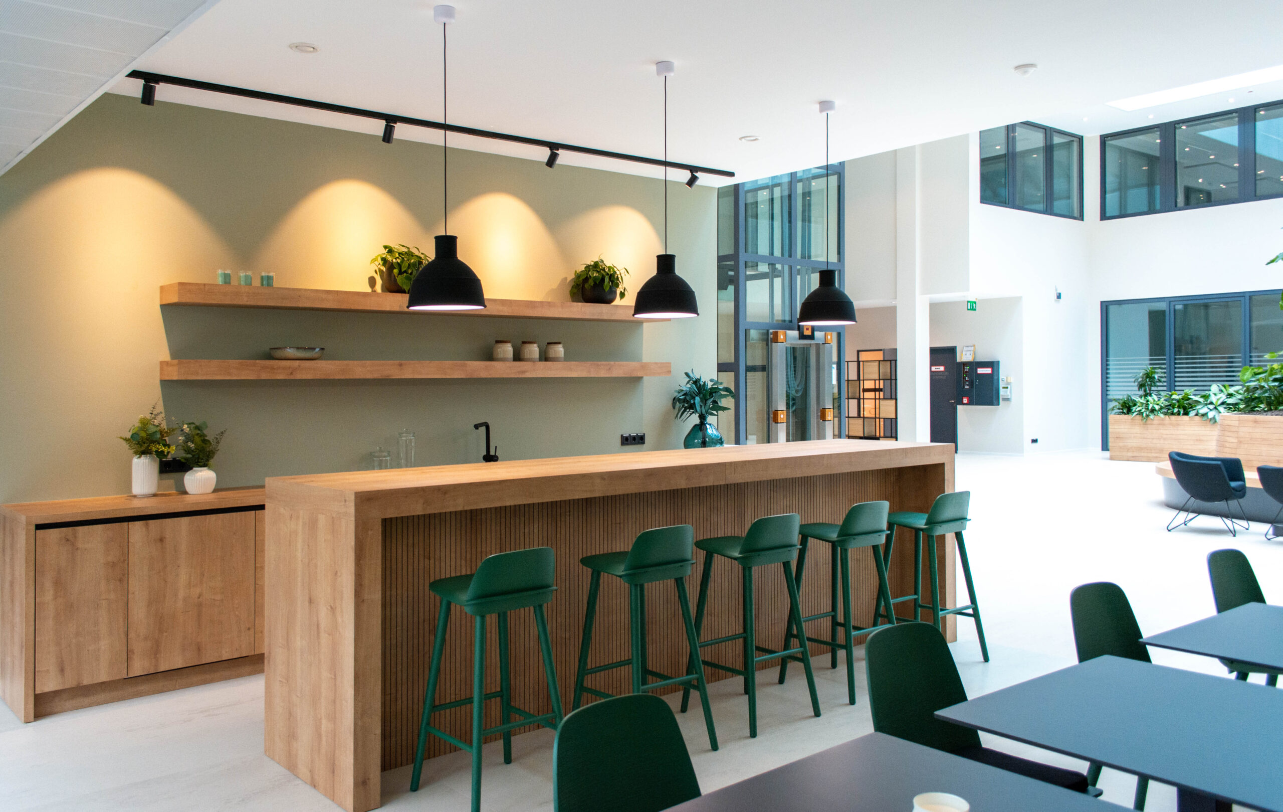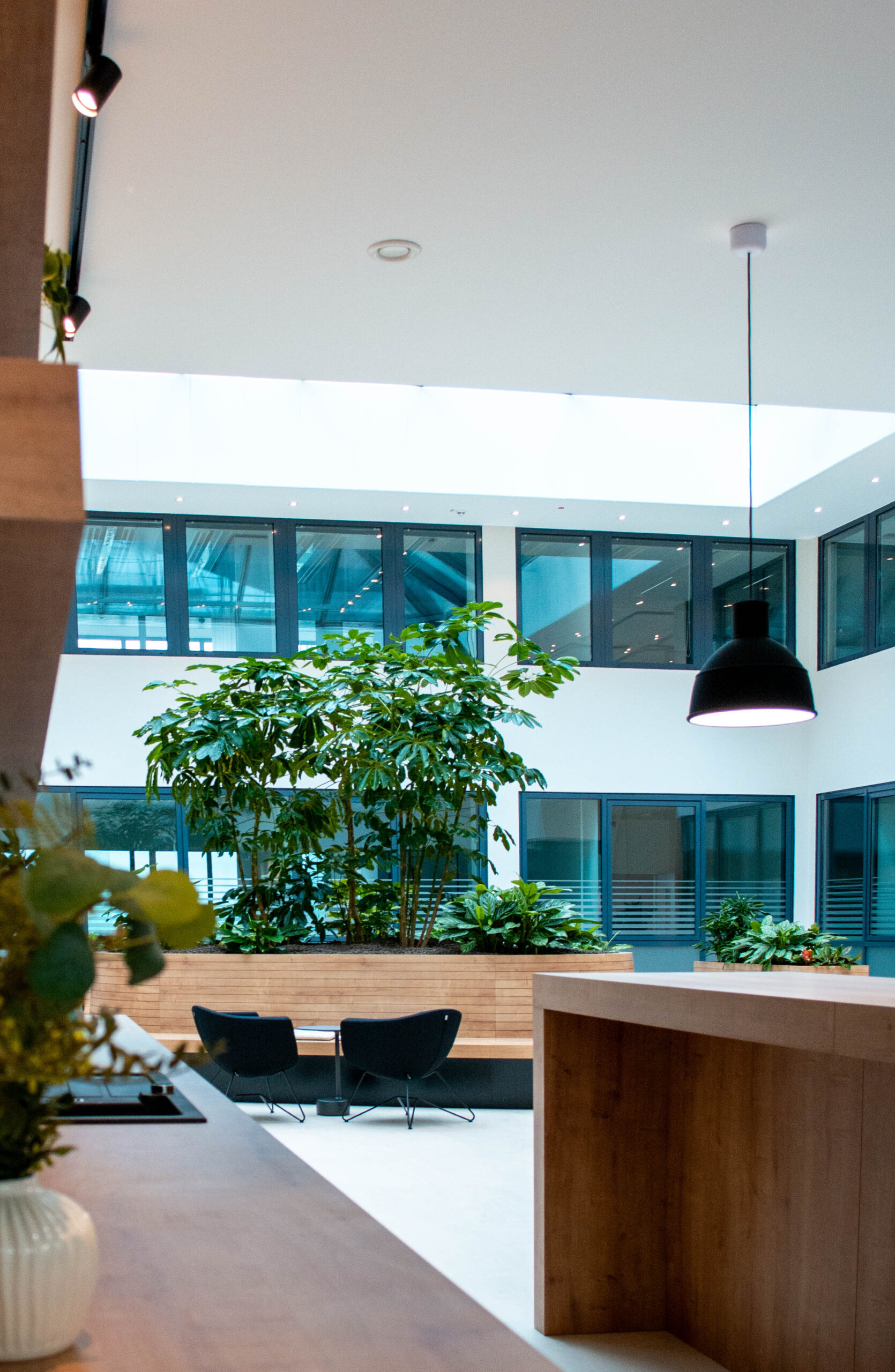 Wir haben das Foyer und das Musterbüro warm und einladend gestaltet, mit Holz, Grüntönen und Pflanzen.