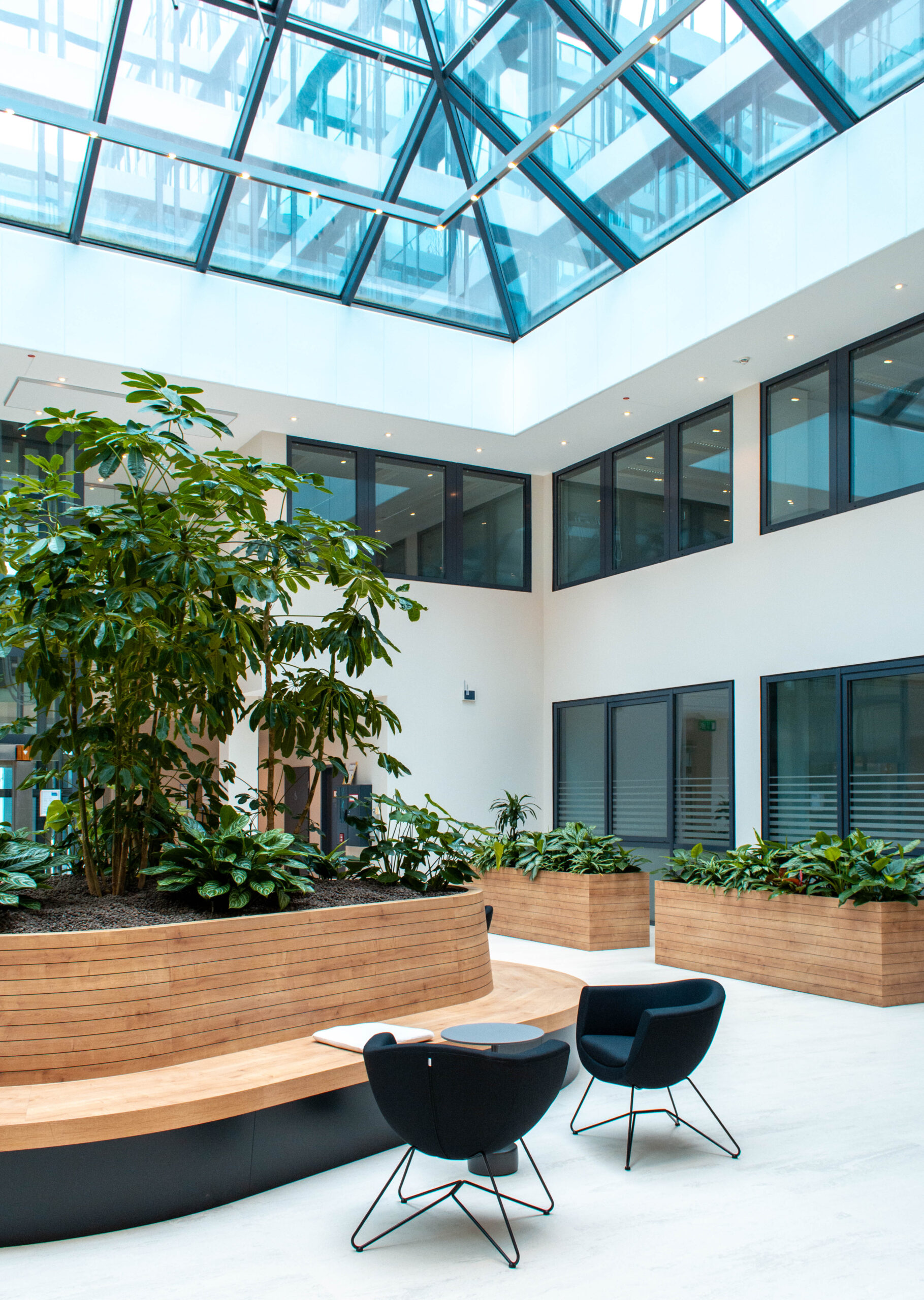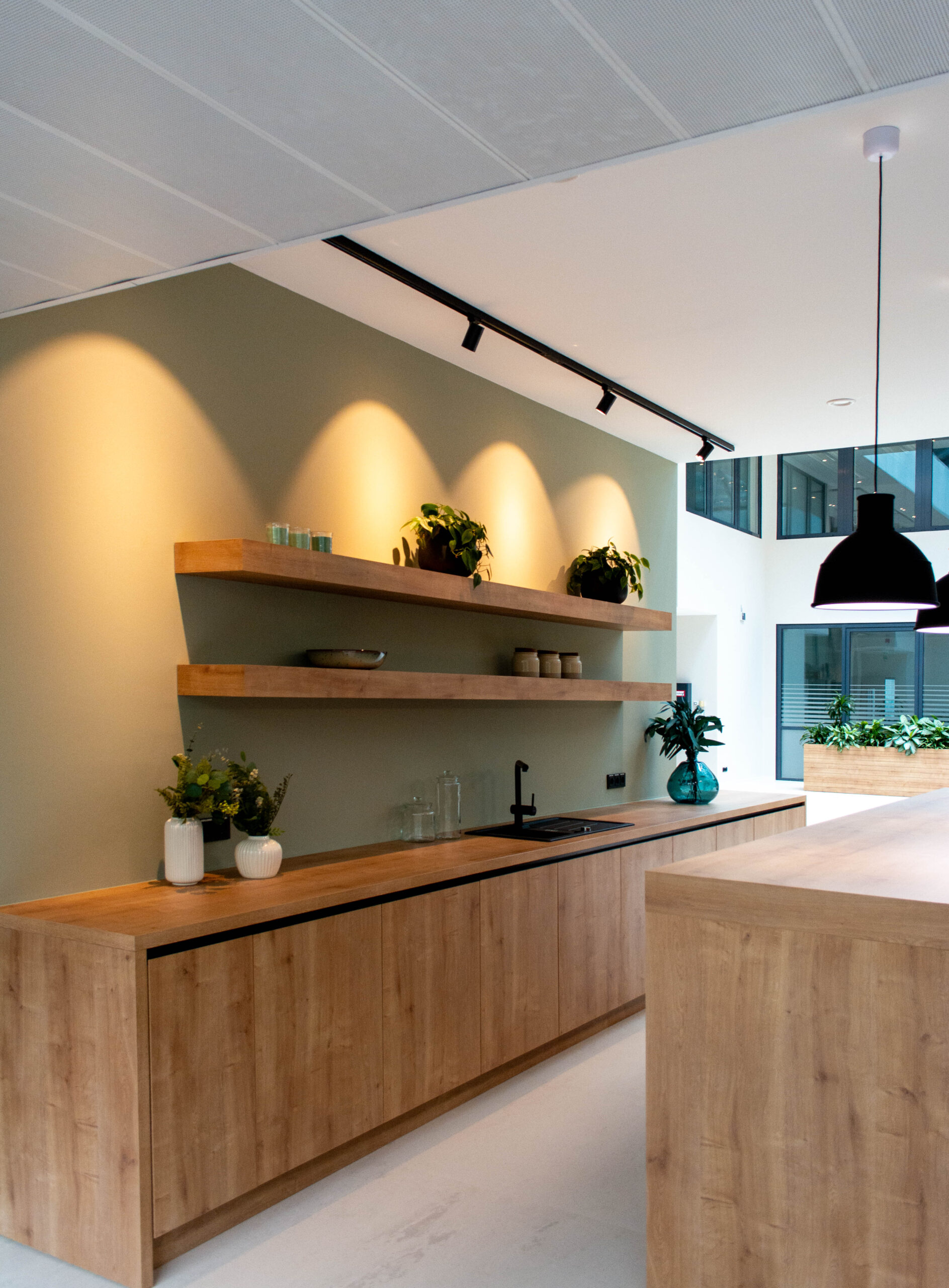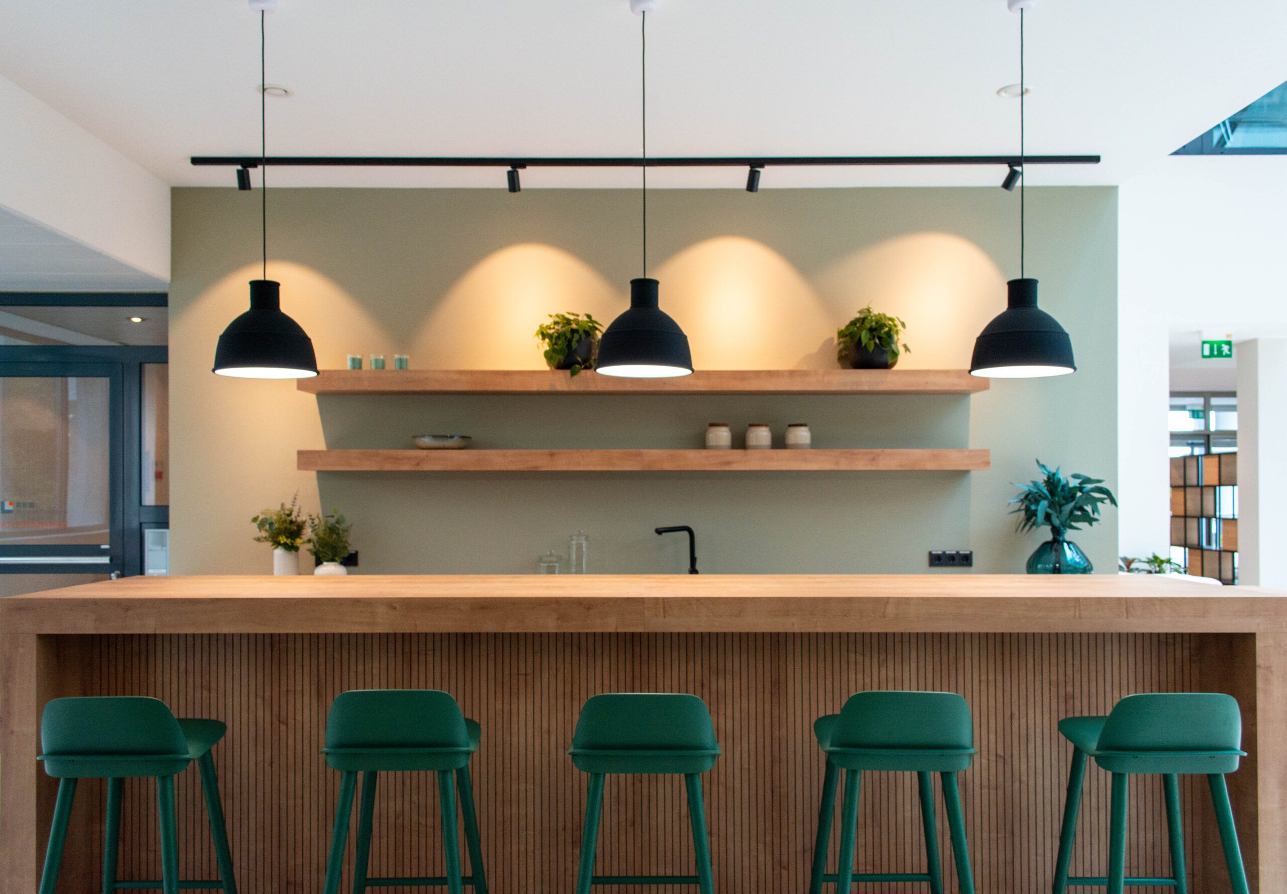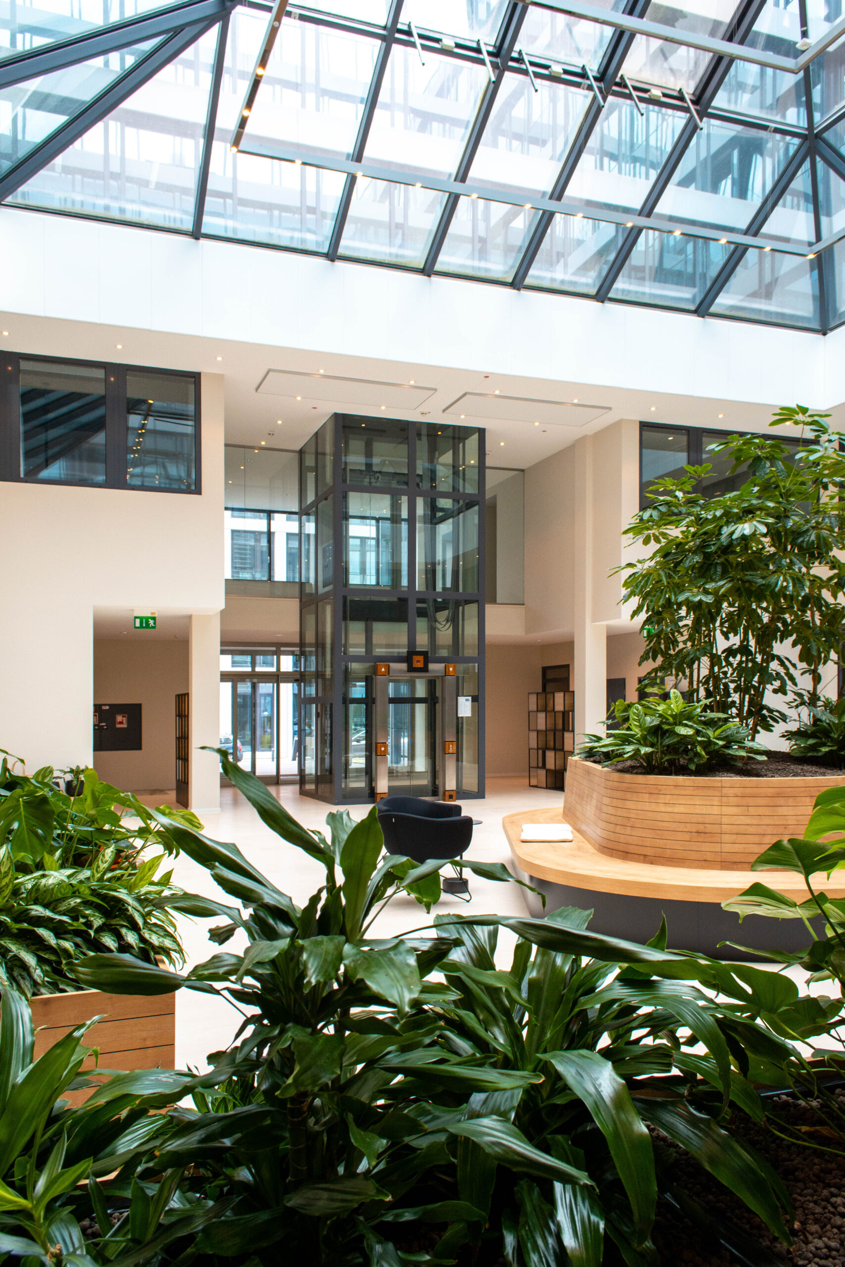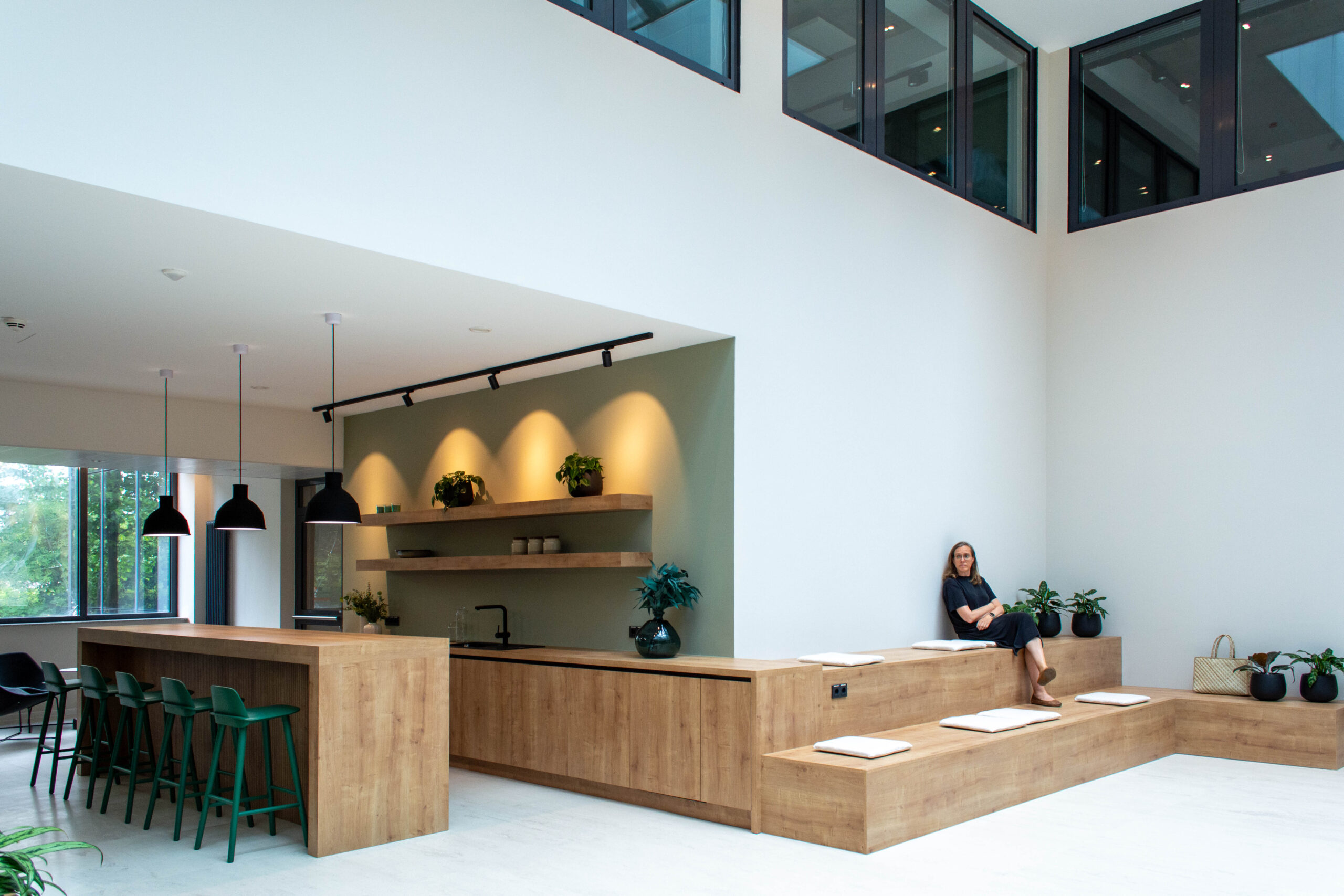 Wir haben das Foyer und das Musterbüro warm und einladend gestaltet, mit Holz, Grüntönen und Pflanzen.