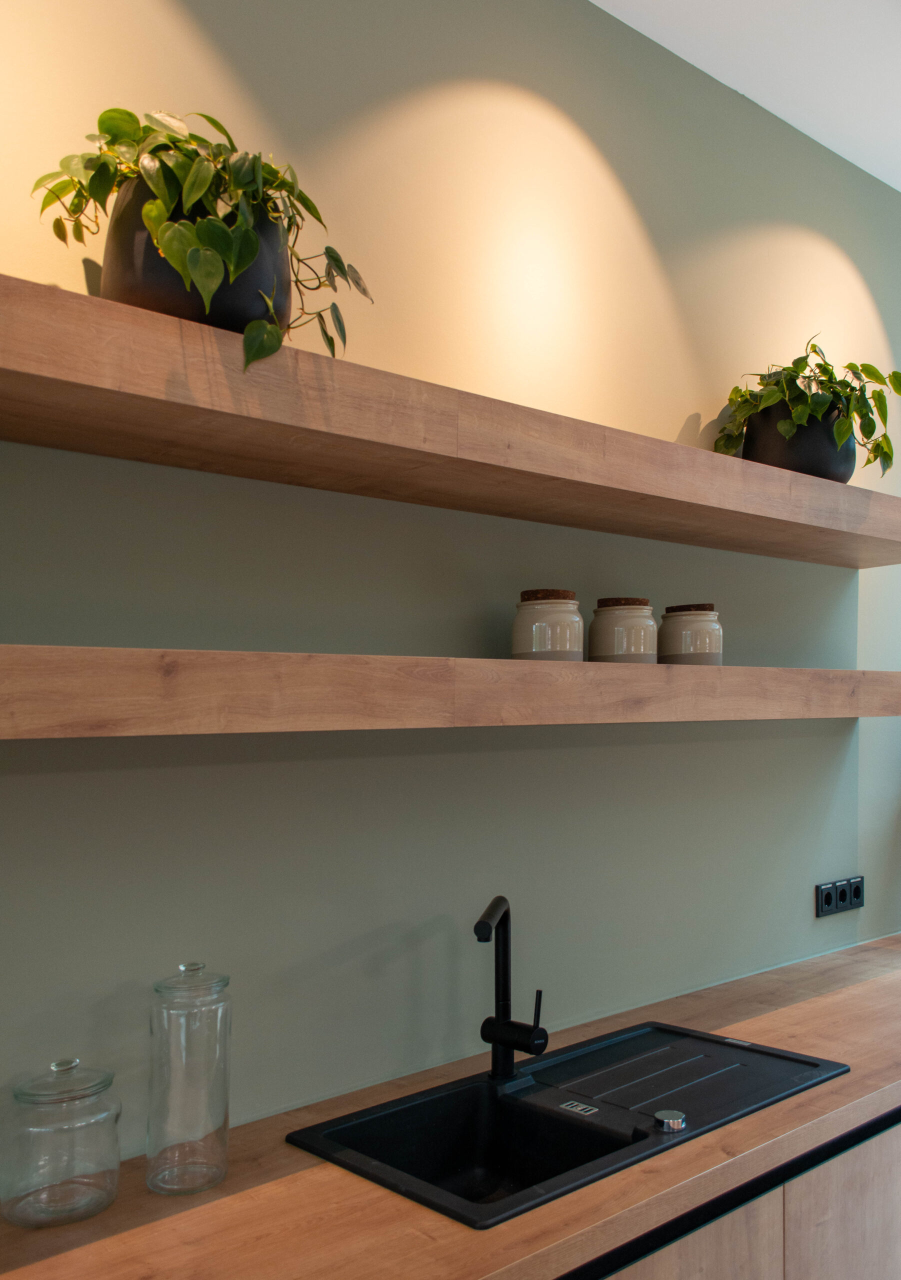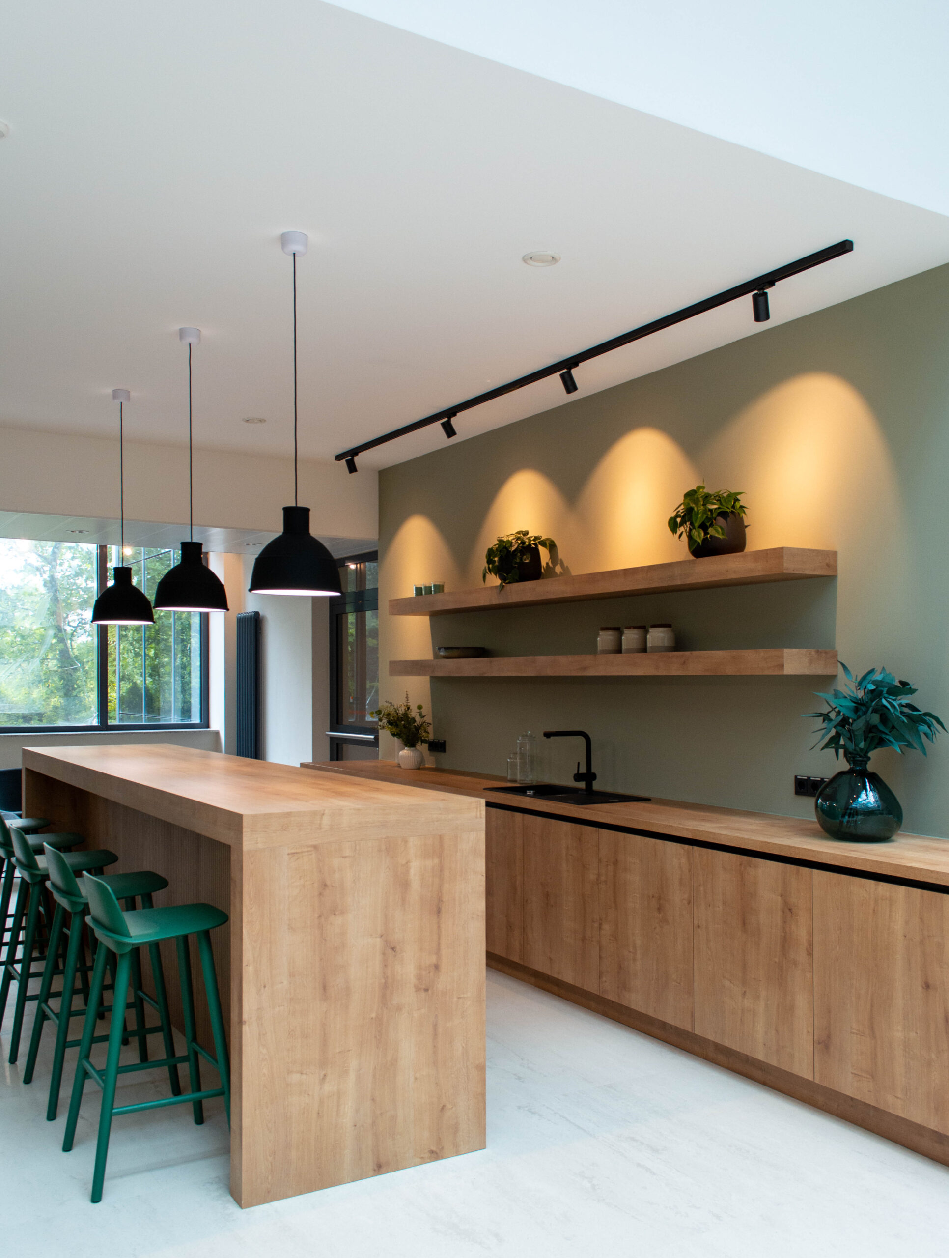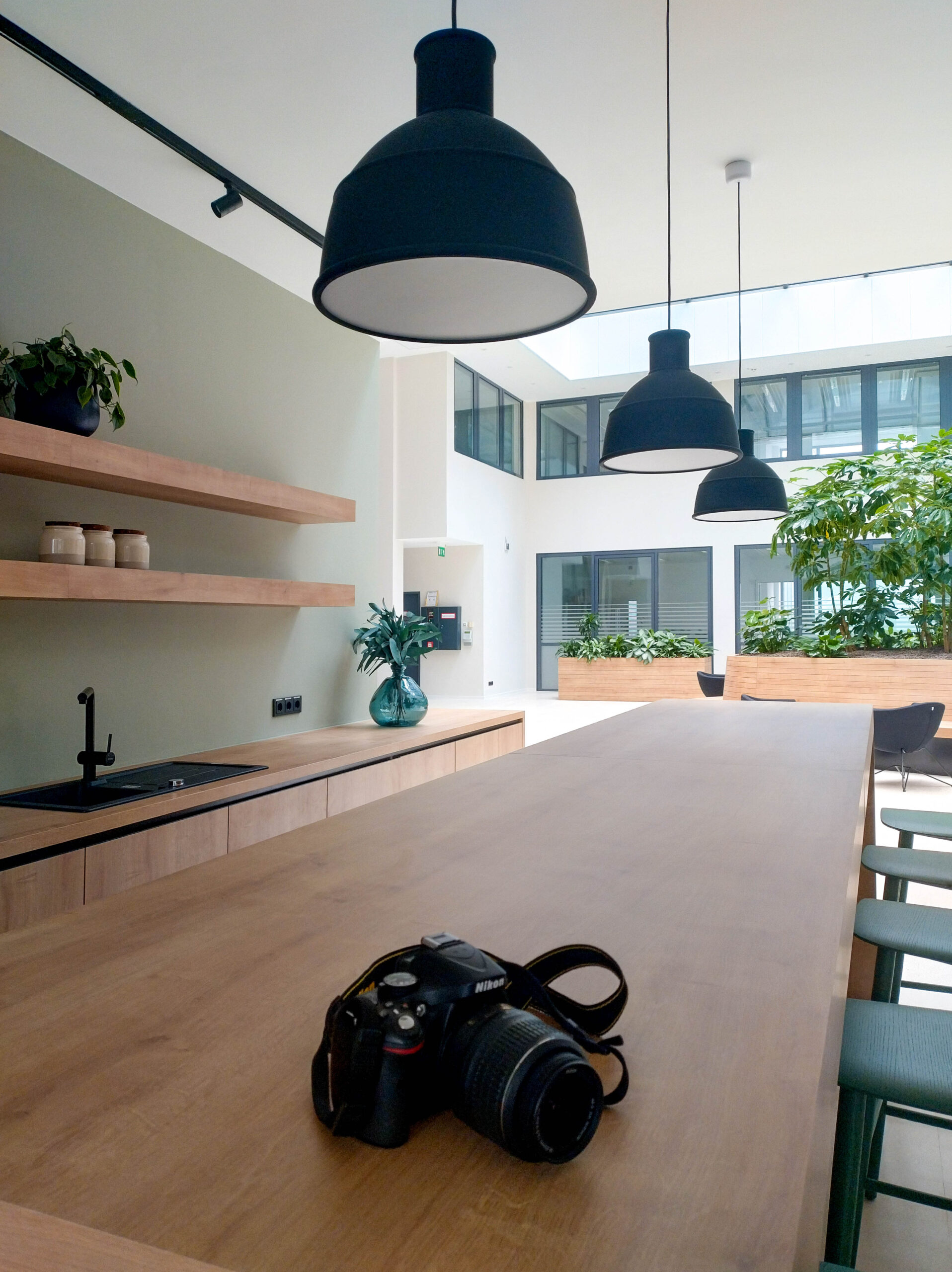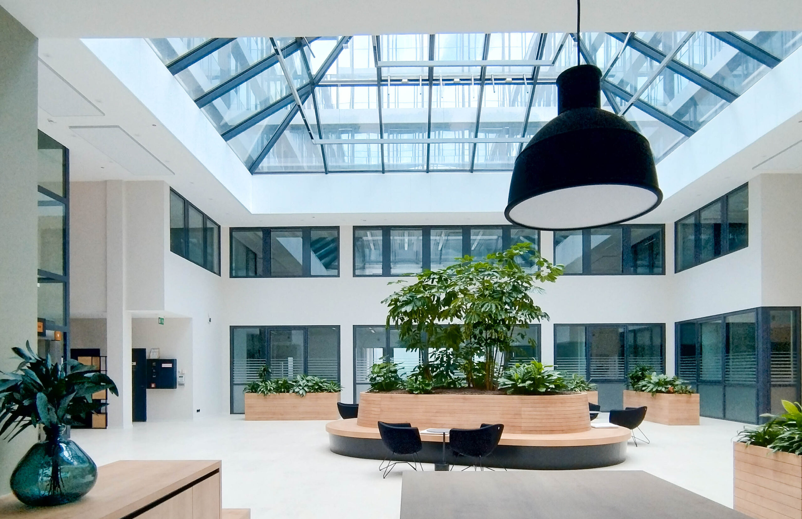 Wir haben das Foyer und das Musterbüro warm und einladend gestaltet, mit Holz, Grüntönen und Pflanzen.