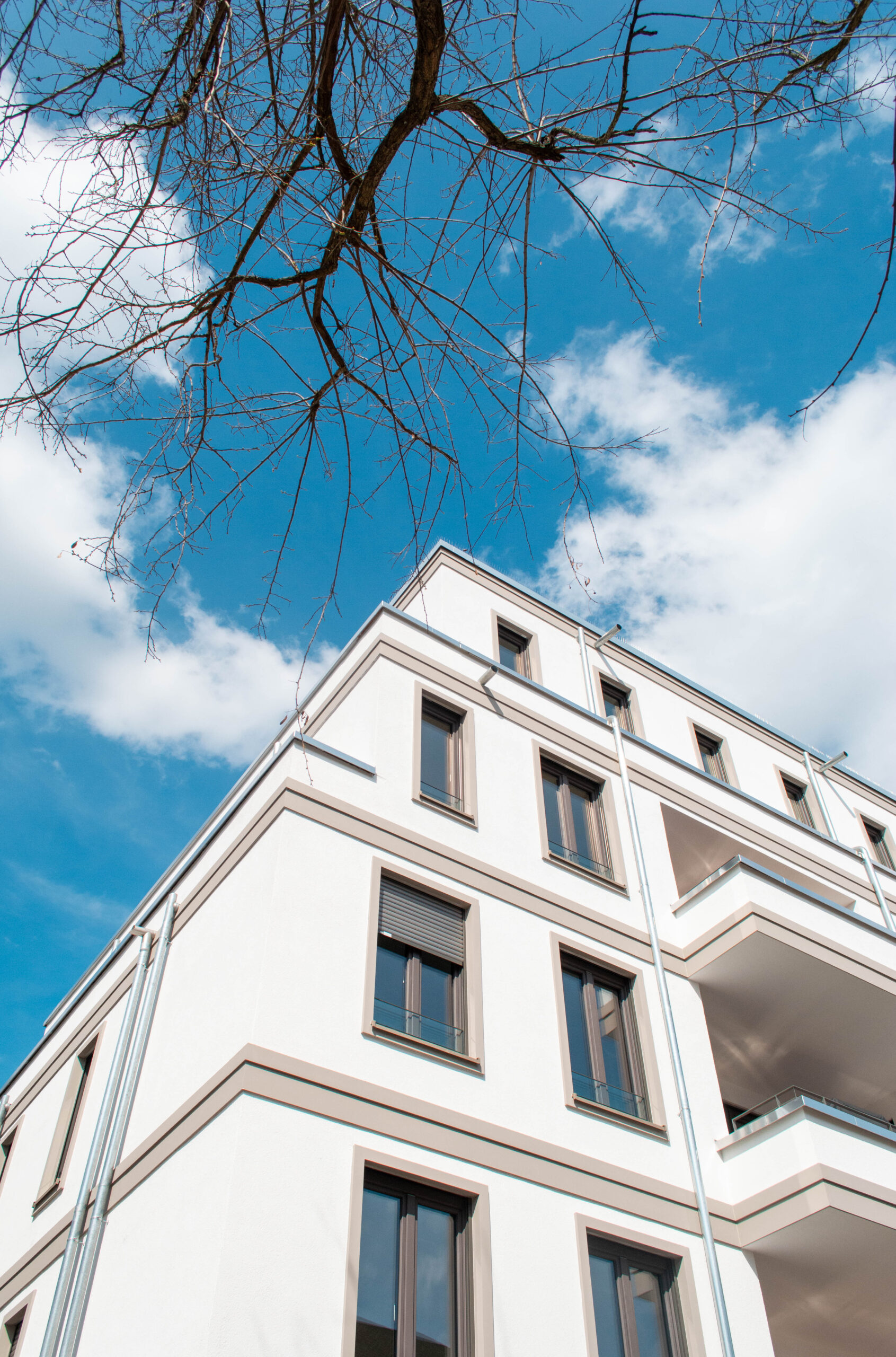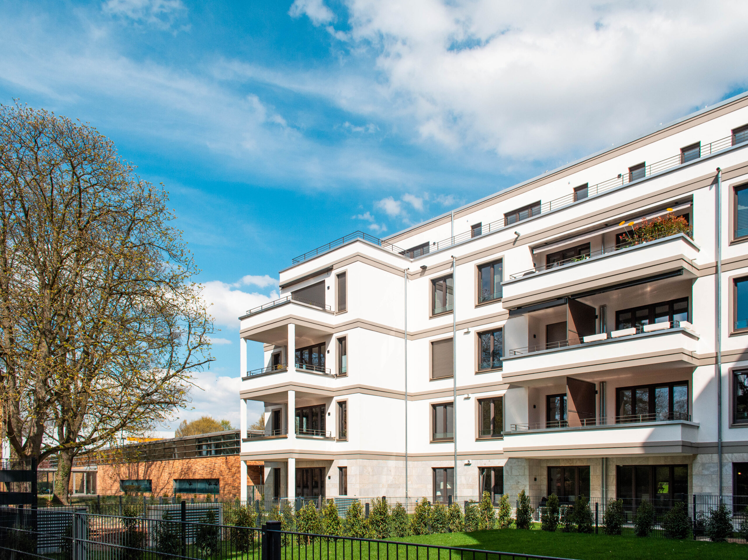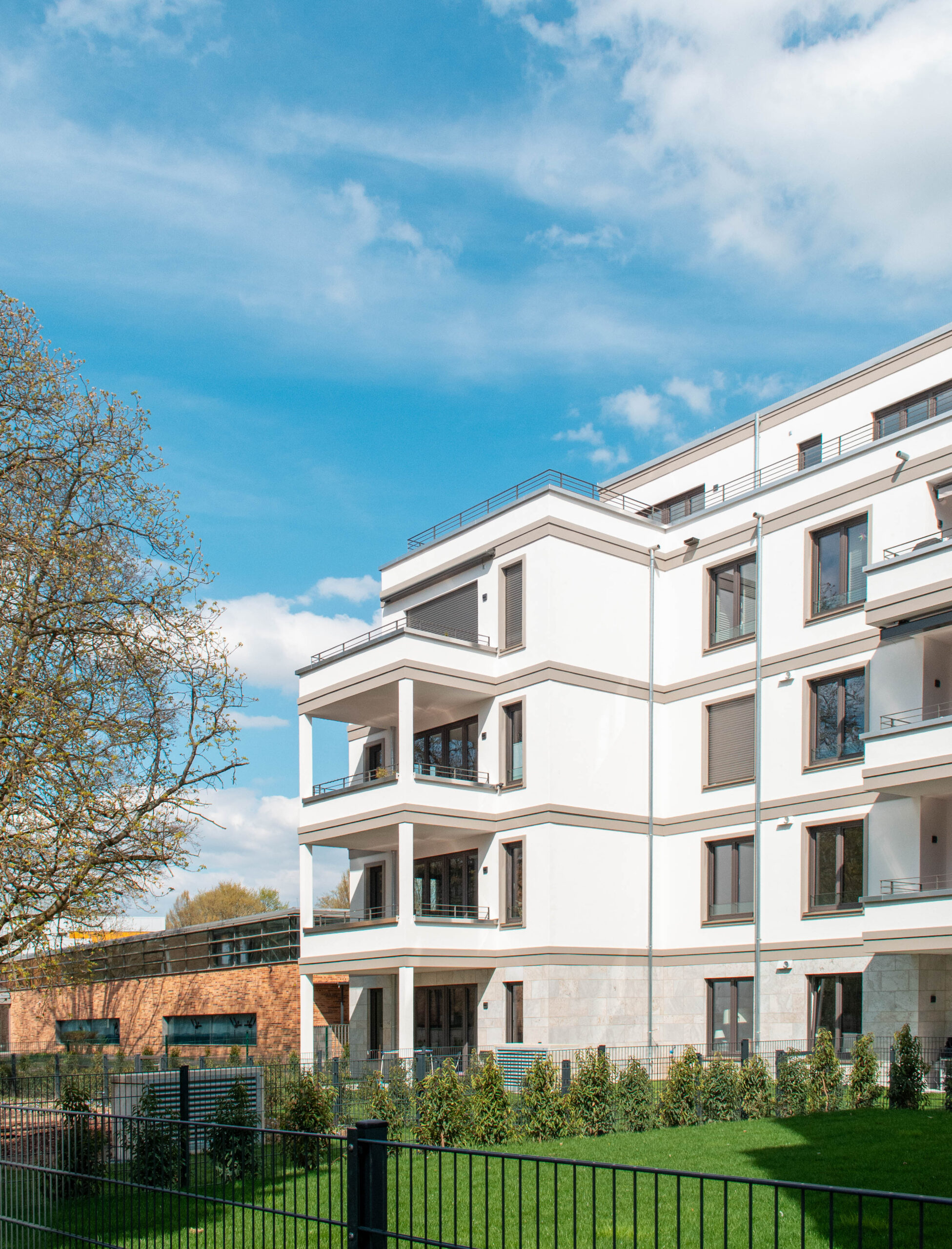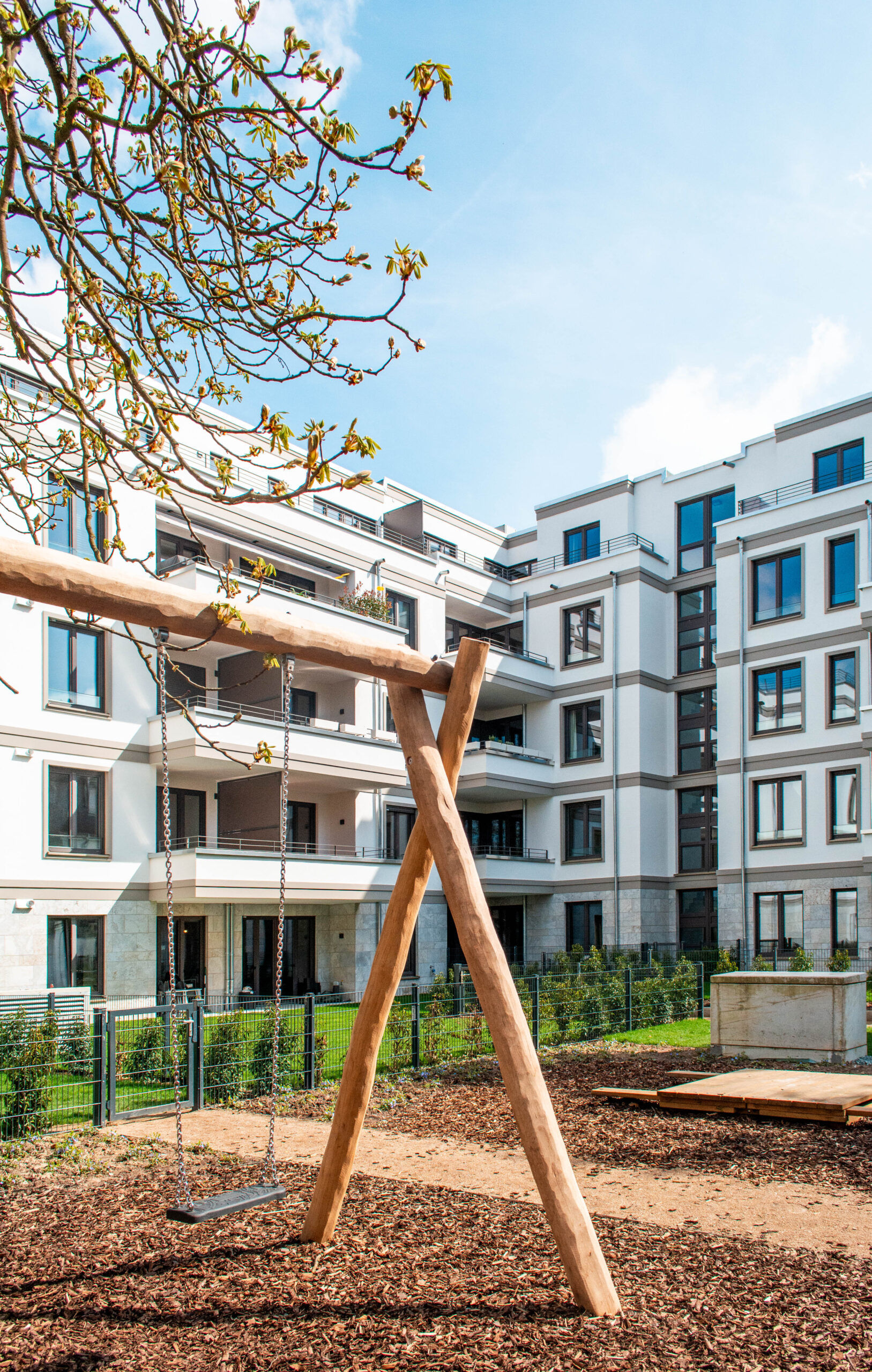 Auf einem über 2.000 m² großen Grundstück entstand ein Ensemble aus 27 Wohnungen mit Tiefgarage, großzügiger Freiflächengestaltung und Spielbereich.
