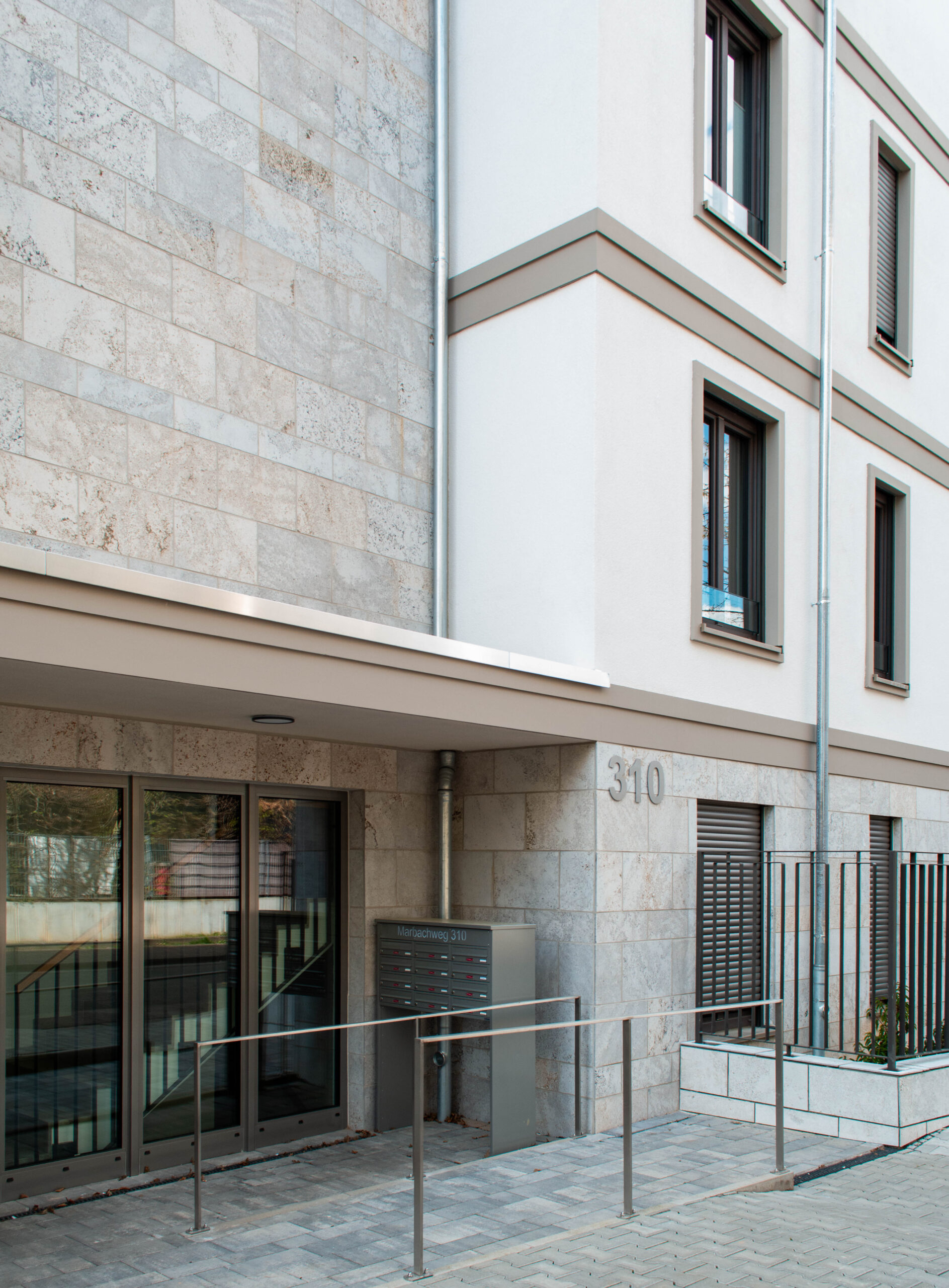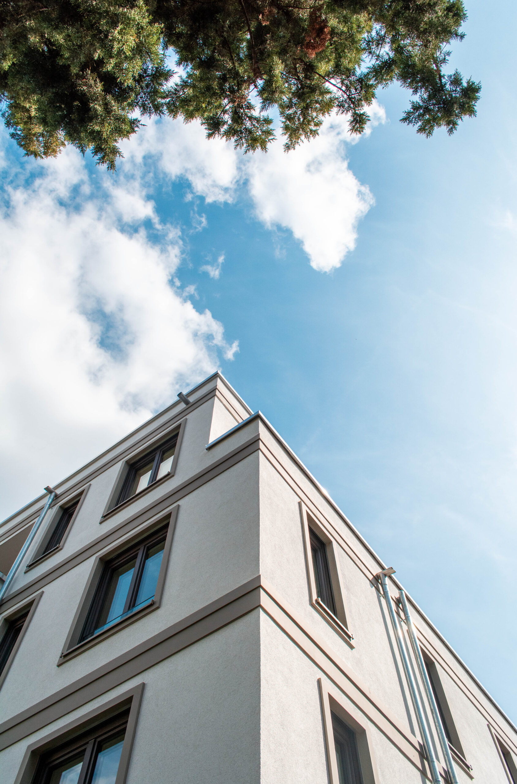 Die Fassade kombiniert moderne Reduktion mit klassischen Elementen wie Gliederungen, Fensterfaschen und ausgewogener Proportion. Materialwahl und Farbgebung schaffen Identität und fügen sich zugleich in den Kontext ein.
